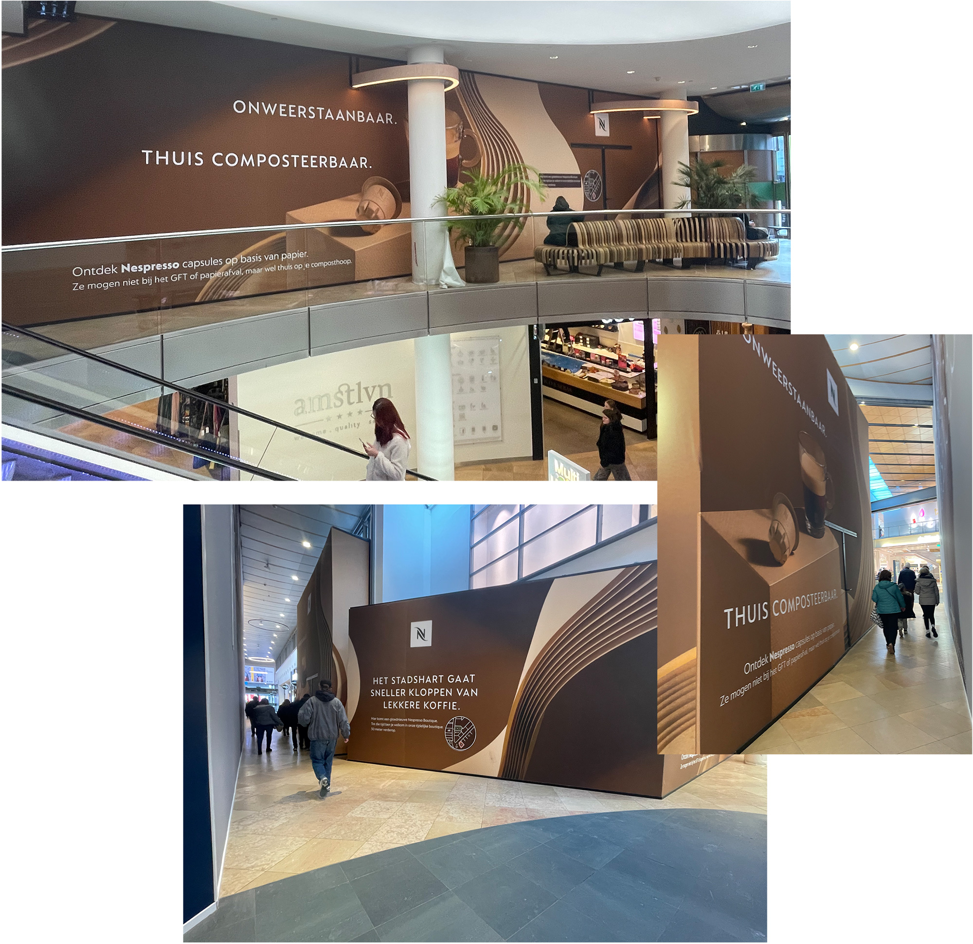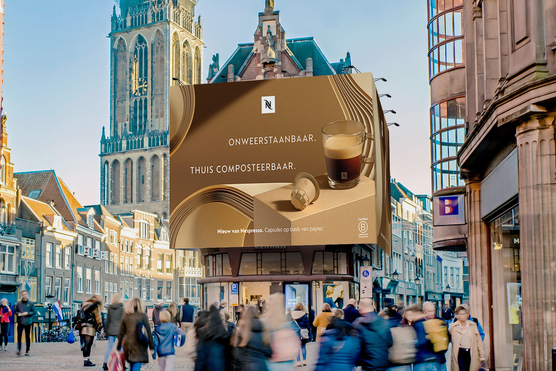 Our creative roll-out covered out-of-home, print, display banners, store windows, and construction site billboards — supported by Nespresso’s international TV commercial featuring George Clooney. The campaign reached audiences across all major Dutch cities, making sustainability visible in every corner of the urban landscape.